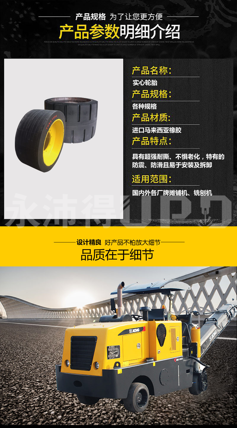 永沛得实心胎适用于铣刨机W100,W100H,W1000F,XG101, XG1003K,华通1米铣刨机,摊铺机:适用于各系列轮式摊铺机,隆声带铣刨鼓五边形实心胎
